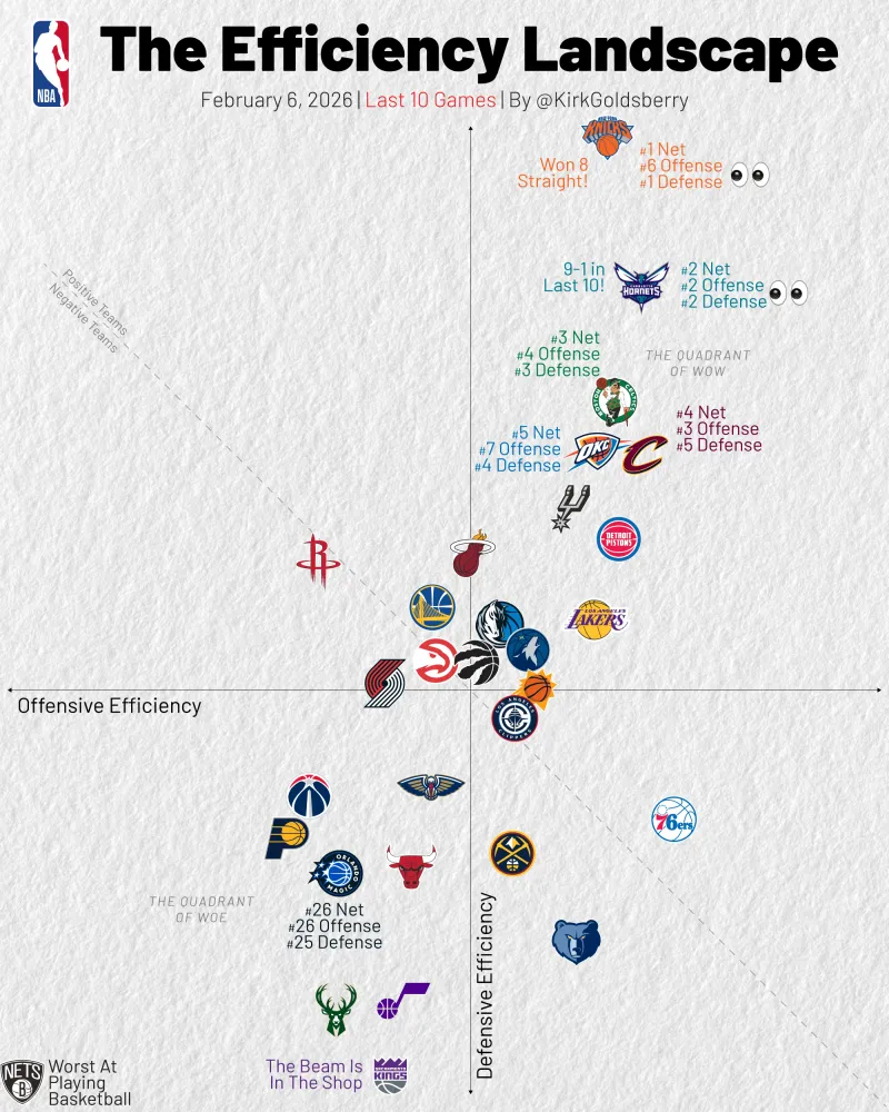 虎扑02月06日讯 美记Kirk Goldsberry制图晒出近10场联盟攻防效率图。